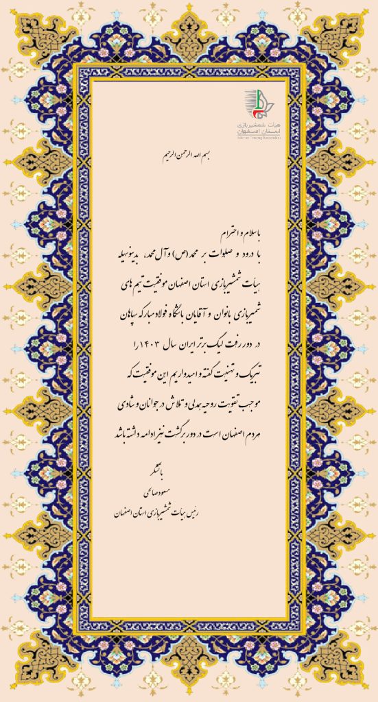 رئیس هیأت شمشیربازی اصفهان در پیامی موفقیت تیمهای بانوان و آقایان فولاد مبارکه سپاهان در لیگ برتر ۱۴۰۳ را تبریک گفت.